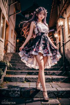 (long legs:1.4),(blurry background:1.3),(long legs:1.4),masterpiece,day,bajinzi,best quality,(ultra detailed:1.3),((((charmingcobblestonestreets),))),(purple hair:1.3),hand between legs,unity 8k wallpaper,white dress,(lantern:1.2),(hair ornament:1.2),looking at viewer,hair ornament,1girl,(photorealistic:1.4),(rock steps extending upwards:1.3),cherry blossom tree,sun,long hair,1girl,solo,purple hair,long hair,