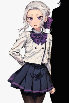 (extremely detailed CG unity 8k wallpaper), (masterpiece), (best quality), (ultra-detailed), (best illustration), (best shadow), (absurdres),cowboy shot,1girl, solo, shino,purple eyes, skirt, looking at viewer,(white background:1.2), long sleeves, ribbon, school uniform, from side, pleated skirt, hair ribbon, blue skirt, closed mouth, ascot, shirt, purple ribbon, jacket, white hair,black pantyhose,rolling eyes,blank eyes,serafuku
