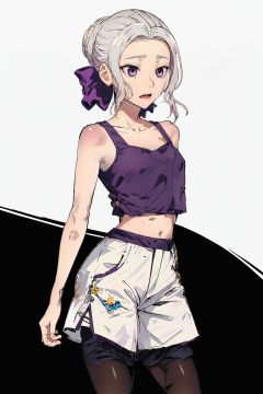 (extremely detailed CG unity 8k wallpaper), (masterpiece), (best quality), (ultra-detailed), (best illustration), (best shadow), (absurdres),cowboy shot,1girl, solo, shino,purple eyes, skirt, looking at viewer,(white background:1.2),ribbon, from side,**** top, dolphin shorts, hair ribbon,closed mouth, purple ribbon, white hair,black pantyhose,rolling eyes,blank eyes,serafuku