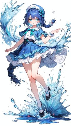[(white background:1.8)::10], (best quality:1.2), masterpiece, (beautiful and clear background), (depth of field:0.75), (ink splashing:0.95), (color splashing:0.85), (color painting:0.95), Rayleigh scattering, (full body:1.25), (++Lovely delicate face++), (messy floating blue hair and emerald eyes:1.15), (braid), (1girl in a (blue and white dress) with a white_Beret), Wave, Bubble blast off, 2legs