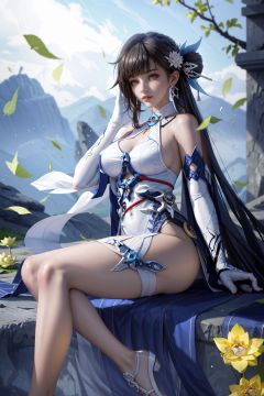 realistic,sushangb3, white-blue dress, white gloves, thigh strap,high heels, large breasts, very long hair,blue hair ornament,two legs,sitting,