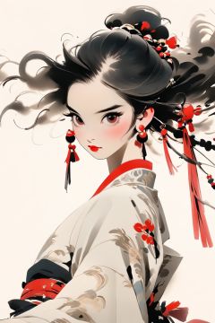 minimalism,1girl, solo, earrings, jewelry, hair ornament, looking at viewer, black hair, blush, makeup, red lips, portrait, simple background, tassel earrings, chinese clothes, ,jianjue, dazzling red eyes, detailed clothing,(detailed clothing, tightly holding sword in hand:1.5)