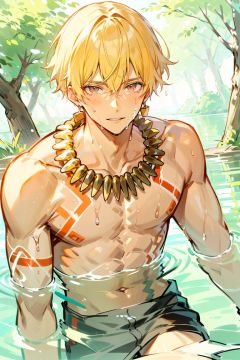 masterpiece,best quality,male focus,(manly),masculine appeal, handsome face,finely detailed eyes and face, youthful face,(solo),(alone),detailed eyes, Perfect features,(20-year-old male),narrow waist,1boy, <lora:gilgamesh-000007:1>gilgamesh, gilgamesh \(fate\), 1boy, male focus, jewelry, solo, earrings, necklace, looking at viewer, partially submerged, tattoo, wet, water, tree, outdoors, hair between eyes, bangs, nature, smile, parted lips