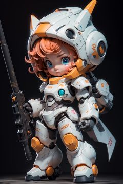 BJ_Cute_Mech,1girl,solo,looking_at_viewer,blue_eyes,holding,standing,full_body,weapon,chibi,holding_weapon,orange_hair,gun,blush_stickers,helmet,black_background,holding_gun,android,mecha_musume,joints,robot_joints,cinematic lighting,strong contrast,high level of detail,Best quality,masterpiece,White background,<lora:Cute_Mech_style(4080):0.7>,