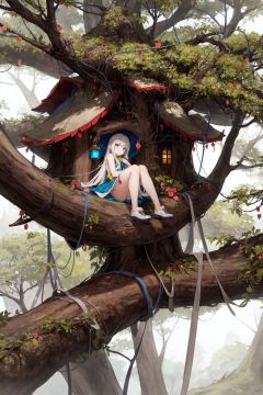 (Yggdrasil:1.2), (treehouse:1.3), (Detailed treehouse:1.3), Lots of detailed leaves, (big treehouse on tree:1.3)Mountains and forests in the distanceBREAK(solo:1.2), (1 girl sitting at treehouse:1.2), (on tree), blue eyes, white hair, wearing traveller suit(detailed light), (an extremely delicate and beautiful), volume light, best shadow, flash, Depth of field, Oily skin