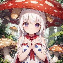 (monsterification:1.3), (1 giant mushroom_girl, wearing Spotted dress, spotted mushroom hair), (spotted mushroom hat:1.2), (upper body), (cute face), beautiful eyes