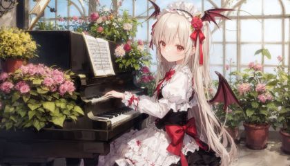 (outline), (emphasis lines), (detailed 8K wallpaper)(from side), (cowboy shot), (1 girl playing piano:1.2), sitting, (floating musical note around girl:1.4), detailed European pianoThe girl has (long yellow hair), red eyes, eyes half closed, smile, has(a pair of large black wings<(great demon wings, long bat wings)>), (solo)The girl wearing (white lolita dress with a red bow), hair flower, (ram horns), (eromanga:1.2), (megami:1.2), (lolita fashion:1.2)BREAK(Detailed musical notes:1.2), piano, detailed room, (greenhouse)Blurred background, fog in the distance, (Potted plants background), window