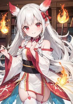 (outline:1.3), (emphasis lines:1.3), (an extremely delicate and beautiful), (eromanga:1.2), (megami:1.2)1girl, white skin, red eyes, pout, elf ears, canine teeth, streaked hair, multicolored hair, split-color hair, gradient hair, colored inner hair, very long hair, wavy hair, indian style, shushing, ((burning feathers)),(feathers_made_of_ice),(frozen feathers),(((ice and fire together))), wizard robe, smile, hair rings, metal collar, thighhighs, indoor, library,