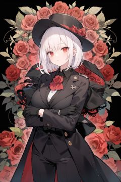 white hair,big breasts,red eyes, high detail, expressionless,{Glowing eyes},short straight hair, red roses,Black gloves, trench coat, suit, brooch,Clothes that are not bare,{{gangsters}},Wide-brimmed hat,black Suit hat,There was lace on the front,