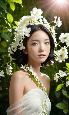 xs_zwr_t3, 1girl, solo, flower, looking at viewer, lips, realistic, upper body, bare shoulders, black hair, plant, white flower, dress, hair flower,<lora:xszwr:1>,