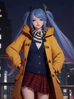 WZRYsunshangxiangSZLR, 1girl, solo, long hair, blue eyes, twintails,parted lips, plaid skirt,coat,scarf, vest,blue hair,<lora:WZRYsunshangxiangSZLR:0.75>,looking at viewer, cityscape, night, mature female, standing, hand on hip, multicolored hair,