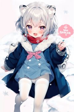 cute,Infant,solo blue shirt,blue sailor coat,loli,full body,white hair,snow leopard ear,white background,pink eyes,laugh,happy,white pantihose,white pantyhose,red armband,