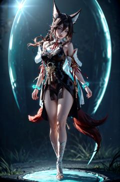 frozen nature, flower, subsurface scattering, transparent, translucent skin, glow, bloom, Bioluminescent liquid, 3d style, cyborg style, Movie Still, Leonardo Style, warm color, vibrant, volumetric light, (full body:1.2), looking at viewer, <lora:tingyun-v4-v100-000006:0.85:lbw=char>, tingyun, 1girl, animal ears, green eyes, dress, animal ear fluff, brown hair, jewelry, short, bracelet, hair between eyes, breasts, chinese clothe, fox tail, <lora:EnvyBetterHands LoCon_beta2 辅助:0.55>, ( good hands, nice hands:0.5), (beautiful_face), ((intricate_detail)), clear face, ((finely_detailed)), fine_fabric_emphasis, ((glossy)),