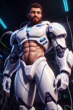 (african man) wearing white mecha power armor, glowing, cables, wires, futuristic lab background, medium hair, transparent plastic, beard, upper body, science fiction, ((abs)), best quality, masterpiece, highly detailed, realistic, (detailed background), depth of field, soft focus, intricate details, 8k, cartoon, 3d, photo of a man,