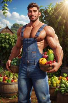 (latino man), wearing naked overalls, farming, crops, plants, greenhouse, barrels, bushels of fruits and vegetables, sunlight, (smile:0.5), dirty clothes, sweaty, looking at viewer, best quality, masterpiece, highly detailed, realistic, (detailed background), depth of field, soft focus, intricate details, 8k, cartoon, 3d, photo of a man,