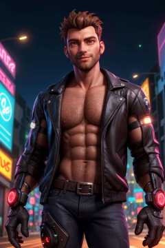wearing futuristic black jacket with glowing lining, neon city lights, sharp focus, futuristic cyberpunk city street, soft lighting, (smirk:0.7), (face portrait), (close up:1), cybernetic parts, science fiction, pectorals, glowing cybernetic eyes, (brown eyes), looking away, muscular, best quality, masterpiece, highly detailed, realistic, (detailed background), depth of field, soft focus, intricate details, 8k, cartoon, 3d, photo of a man,