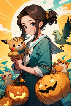 chick,too_many,stuffed_toy,stuffed_animal,stuffed_cat,:3,dog,hamster,teddy_bear,cat,ghost,bird,pokemon_\(creature\),kero,pumpkin,pikachu,jack-o'-lantern,bear,Kamado_Nezuko,WZRYbuzhihuowuYP,sailor moon,1girl,女帝,One piece