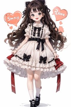 qzqban, 1girl, solo, bow, green eyes, dress, white dress, long hair, food, blonde hair, two side up, fruit, white background, short sleeves, smile, hair bow, black bow, puffy sleeves, shoes, full body, bangs, looking at viewer, simple background, open mouth, puffy short sleeves, :d, blush, standing, very long hair, standing on one leg, socks, fang, white socks, yellow footwear, hair intakes, holding