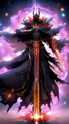 Conceptualization, Fantasy style, weapons, advanced colors, sword, Weapon, Aura, Armor, single, Cloak, Starry body, Ember