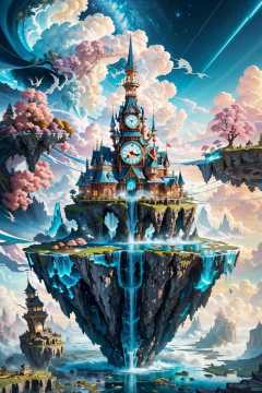 clock_realm,clock,((masterpiece)),((best quality)),8k,high detailed,ultra-detailed,illustration,concept art,fantasy,a floating island,candy tree,porcelain house, (floating waterfalls:1.1),(floating islands in the sky:1.2),magical creatures,capturing the otherworldly beauty of a floating fantasy realm,<lora:ClockRealm:1>,