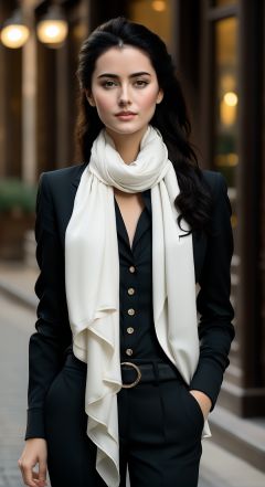 1girl,scarf,long hair,pants,solo,ring,jewelry,black pants,shirt,belt,hand in pocket,white shirt,blurry,blurry background,looking at viewer,black hair,brown eyes,formal,white scarf,standing,black jacket,realistic,lips,buttons,cowboy shot,outdoors,long sleeves,pant suit,<lora:weijin:0.7>,