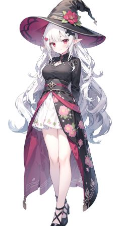 (masterpiece:1.2), (arms behind back:1.2), best quality, game cg, 1girl, solo, long hair, white hair, hair ornament, dress, full body, looking at viewer, simple background, red eyes, standing, hair flower, white background, closed mouth, long sleeves, skirt, wavy hair, blush, large breasts, smile, very long hair, floral print, witch hat, elf,