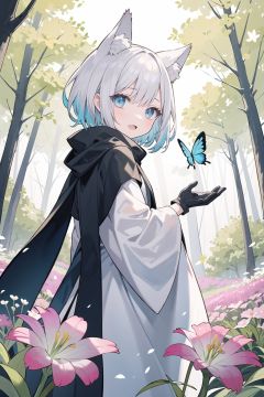 (masterpiece:1.2), high_quality ,occultism, Aestheticism Painting , (flat color), best quality, soft lighting, (depth_of_field:1.3),(solo:1.4), [close-up], (1girl), detailed beautiful blue eyes, (silvery hair) , wolf_ears, short_hair,archbishop_robe ,largr_sleeve, grey_cloak, blooming, looking_at_viewer, lily (flower) , blue butterfly, (fantastic colorful),fluorescence, (forest:1.25), tree_shade, (flowers meadows:1.4), flower, leaves, looking back, cute_fang, black gloves, long scarf,