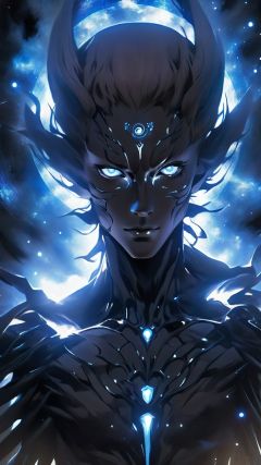 (Conceptualized, Fantasy style: 1.5) Advanced color, a slender human figure with no specific face shape, only two glowing blue eyes. These eyes gleamed in the dark, emitting a mysterious light. The outline of the body is faintly visible, but the overall anonymity is strong, giving it a supernatural feel. The glow of the eyes makes one wonder about the universe and philosophy