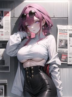 1girl,masterpiece,extremely detailed CG unity 8k wallpape,<lora:报纸墙背景StyliZe_V1.0:0.7>,Newspaper,newspaper wall,<lora:眼睛双:0.8>,<lora:omone_hokoma_agm_style:0.25>,oha style,best quality,(looking_at_viewer:1.1),<lora:kafuka-mix:0.8>,kafukalike,black eyewear on head,purple hair,purple eyes,<lora:GuitarLittleSisterOutiftGLSV1-fixed:0.8>, outfit-gls,sweater,high-waist skirt,long skirt,hip vent,underboob,long sleeves,sleeves past wrists,