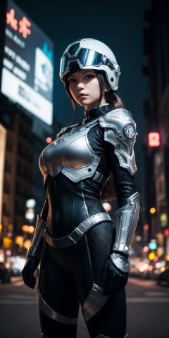 1girll, Humanity,Put on bio armor, shelmet, Fully enclosed helmet, (Solo:1.5),dynamicposes, Cyber city background,best qualtiy,tmasterpiece,c4d,City background lights, Leica 50mm f/1.9, CGArt