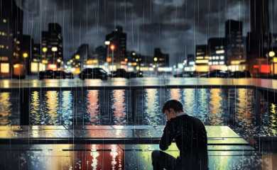 (masterpiece),(blurry),vague,Impressionism,scenery,depth of field,1 man,sitting,back view,city,downtown,on street,(raining:1.2)