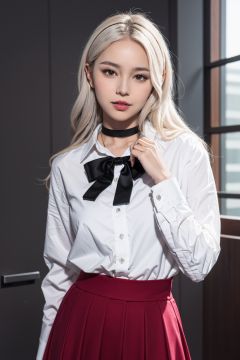 <lora:MAJIXX-形象照:0.7>,majixx,adorable_girl,spider-man,slender,oval face,silver hair,lipstick,mascara,anime_style_blush,big breasts,slender_waist,school_uniform,choker,:d,hands_on_hips,highres,absurdres,incredibly absurdres,wallpaper,realistic,Cinematic Lighting,photo_(medium),fantasy,golden hour lighting,