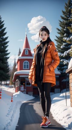 <lora:雪镇:0.8>,<lora:YJ_20230910182544:0.7>,jing,1girl,solo,full body,realistic,cs,snow,outdoors,no humans,ground vehicle,scenery,motor vehicle,sky,snowman,car,tree,day,blue sky,winter,blurry,house,building,road,cloud,depth of field,traffic cone,