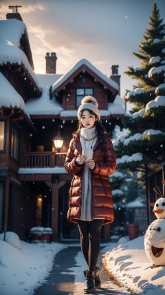 <lora:雪镇:0.8>,<lora:YJ_20230910182544:0.7>,jing,1girl,solo,realistic,cs,snow,tree,snowman,house,outdoors,sky,scenery,winter,day,building,window,chimney,snowing,blue sky,1girl,lamppost,multiple girls,<lora:朝阳_morning sun:0.7>,full body,