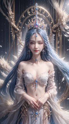 Wearing white lace gloves,Hand refinement,With a smile on your face,wearing a crown,Sea of Flowers,queen temperament,red bellyband,Hide Finger,Bust D Cup,red pupil,Dressed in tulle,shawl long hair,blue theme hair,Highest picture quality,upper body,Arms open,Facial refinement,a beautiful woman,by the creek,Falls Stream