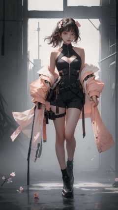masterpiece, best quality,highres, 1girl, techwear, full body, bare shoulders,  <lora:techwear-000005:0.8>,peach blossom,