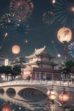 The best picture quality, best visual expression, complete structure, master work,In ancient China, Having a close and distant view,Chang'an Avenue, Sister Lantern, bustling street scene, and bright fireworks in the sky