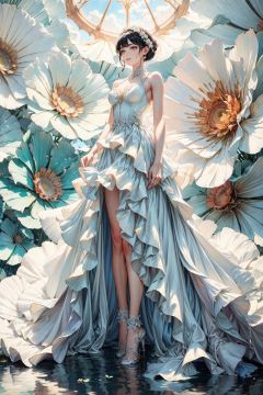 Soft light, masterpiece, 1 girl, (self photo: 1.2), (luminous skirt), luminous skirt, white background, standing in front of french window, (blue and orange lights), clear details, floating hair, delicate facial features, extremely beautiful face, sky, cloud, masterpiece, best quality,