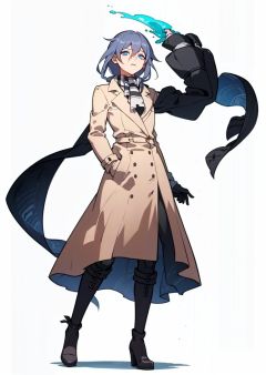 (masterpiece:1.3),(the best quality:1.2),(super fine illustrations:1.2),(Masterpiece),high quality,high detail,(white background:1.2),looking at viewer,(SOLO:1.4),outline,simple background,, coat,jacket,black legwear,hair between eyes,blue eyes,boots,double-breasted,knee boots,low-tied long hair,lace-up boots,black footwear,checkered scarf,grey hair,