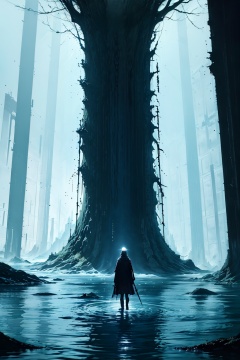DarkTheme,  solo,  holding,  weapon,  outdoors,  sword,  water,  holding_weapon,  tree,  no_humans,  scenery,  1other, <lora:EMS-40341-EMS:0.800000>