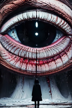 DarkTheme,  1girl,  looking_at_viewer,  red_eyes,  standing,  coat,  size_difference,  giant,  one-eyed,  horror_(theme),  eye_focus, <lora:EMS-40341-EMS:0.900000>