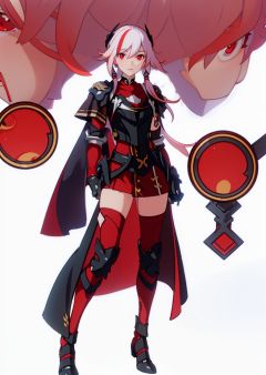 (masterpiece:1.3),(the best quality:1.2),(super fine illustrations:1.2),(Masterpiece),high quality,high detail,(white background:1.2),looking at viewer,(SOLO:1.4),outline,simple background,, , red skirt,skirt,white hair,pink hair,shoulder armor,hair ornament,armor,thighhighs,streaked hair,red hair,multicolored hair,red eyes,fu_hua,hair_between_eyes,solo,
