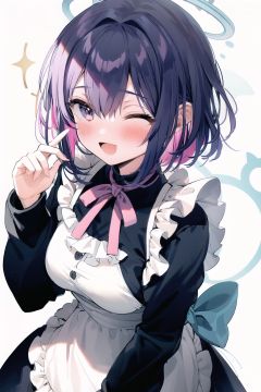 1girl, solo, apron, halo, hair over one eye, closed eyes, smile, white background, dress, white apron, simple background, long sleeves, multicolored hair, braid, open mouth, blue hair, alternate costume, blush, bangs, :d, pink hair, black dress, ribbon, frilled dress, enmaided, short hair, hand up, colored inner hair