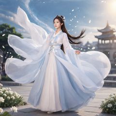 masterpiece, 1girl, Look at me, Handsome, Long hair, Bun, Hanfu, Fly up, Use Holy Light magic, Fantasy art, A fantastic scene, Outdoor, The sky, Under your feet is the city., Light and shadow, Floating petals, Lots of particle effects, Plenty of white flowers, textured skin, super detail, best quality