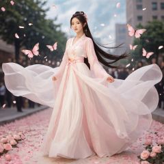 masterpiece, 1 girl, Look at me, Long hair, Bun, White gold-rimmed hanfu, Fly up, Use dark magic., Fire element, Fantasy art, Outdoor, Under your feet is the city., Floating petals, Lots of particle effects, Pink roses, Glowing butterflies, Flying sparks, textured skin, super detail, best quality,