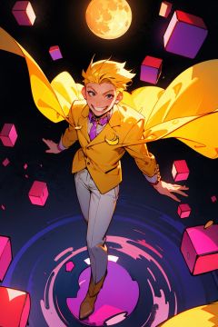 (young 1male:1.4),short blonde flipped hair,colored eyelashes, crazy smile and evil grin,golden metal collar,(flashing golden businesss suit and white trousers:1.2),tall boots,full body, stationery,