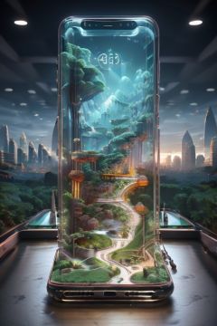 Master's work,of the best quality,a phone from the future,with a transparent shell and cyberpunk circuitry inside. The 3D projection on the screen creates a three-dimensional and beautiful landscape,<lora:mhsj_20230914230500:0.8>,