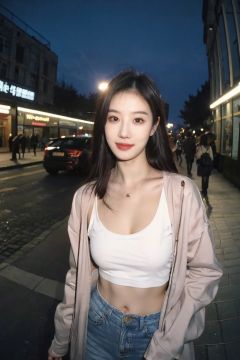 Negative prompt: (masterpiece, best quality, high quality, highres, ultra-detailed),(slim:1.1) beautiful,woman, looking into camera, (fisheye lens:1.3),candid photograph, photo-realistic, (film grain:1.4), (masterpiece:1.2), sharp image,****og style,award winning photo, best quality,(shot with kodak 400:1.3), sharp,skin pores,Big Breasts,8k, best quality, masterpiece:1,2), (realistic, photo-realistic:1,37), top quality, masterpiece, a beautiful woman, wearing a shirt for women crop v neck top white t-shirt korean fashion women t with a tight open gray color jacket, beautiful and toned body, cleavage, floral mini skirt, walking in the suburbs, slightly drizzling night background, in shops with Korean-style shop lights, night atmosphere, slightly wet asphalt, seductive smiles with dimples,,