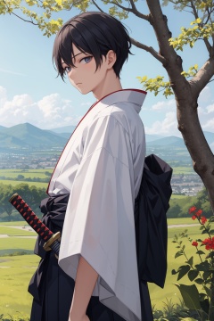 masterpiece, best quality, incredibly absurdress, highres, high detail eyes, high detail background, 1boy, male hakama, from side, katana, blue sky, tree, leaf, looking at viewer, serenity