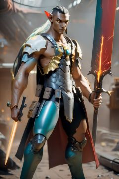 4k full body cinematic shot photo of a male space elf cyber samurai holding glowing sword in sci fi jungle elven mech factory, attack pose, aiming elven rifle pose, slashing pose, matte bronze black sleek red glassy orange and neon teal backlit yellow accent colors, holding glowing lightning sword, weapon master, sword in hand, sword neon glow, neon wrist blades, bulky weathered space marine armor, perfect eyes, glassy eyes, 4k eyes, sci fi daggers on body, clear square eye screen with data displayed, white sclera eye color, 4k realistic eyes, realistic armor texture, bulky full body interlocking armor panels, handsome face, face photorealistic, angry face, aiming elven space rifle, fit, 4k hyperrealistic face, muscular, mature males, photorealistic cyberpunk elf Man, hi-tech equipment, kintsugi gengji from overwatch armor and sword, shaved hair, vampire_teeth, subsurface scattering, perfect_teeth, Extremely detailed face, movie quality face, hyper realistic face, mecha bow and quiver on back, loose wires, spear mecha weapons in hand_energy blade, mecha jetpack, cyberpunk exosuit, 4 thrusters, detailed panel lining, mechanical, high quality, volumetric, freckles, beautiful, dslr, 8k, 4k, ultrarealistic, realistic face, insanely detailed face, natural skin, textured skin, Movie Still, mecha, landscape inside elven spaceship hangar, Lunar eclipse background, lunar orange glow, vengeful amber eyes, elven_ears,Read description, NightmareFlame,NightmareFlame, <lora:EMS-15512-EMS:0.7>, <lora:EMS-21831-EMS:2>, <lora:EMS-17123-EMS:0.5>, <lora:EMS-17129-EMS:1.1>